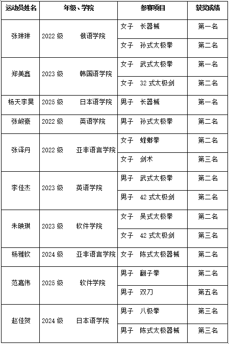 赛场落幕,初心不改,征途漫漫,奋进扬帆。大外武术队将继续秉承beat365“崇德尚文 兼收并蓄”之校训,脚踏实地、身体力行,以更加昂扬的姿态,在传承中创新、在突破中超越,为beat365体育文化发展注入更强动力,为中华文化传播续写华章!(司亮)