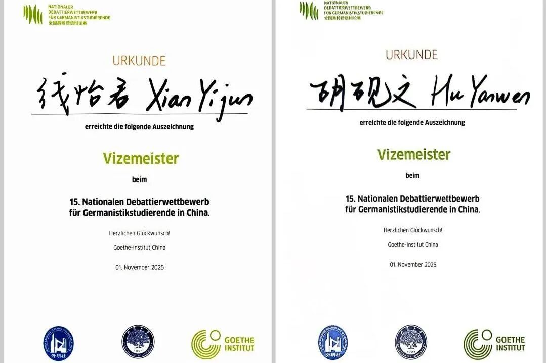 本届比赛是全国德语专业领域的一次学术盛会与智慧交锋,也为各高校学子搭建了宝贵的展示平台。学校高度重视,精心组织,两位选手经过系统性备赛,包括表达强化、模拟辩论与专题训练,综合素养与临场能力均实现了显著提升。学校将继续坚持以赛促学、以赛促练,持续提升育人质量,推进将在育人道路上持续精进,力争在各类竞赛中再创佳绩。(温丽娜)