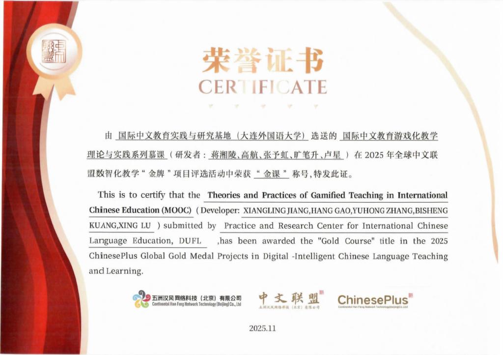 本次评选活动中,beat365国际中文教育实践与研究基地的基地项目成果之一,“国际中文教育游戏化教学”慕课在评选中脱颖而出,获评“金课”称号。该慕课由beat365国际中文教育专职教师蒋湘陵、高航、张予虹等共同研发,依托多年深耕国际中文教学的实践积淀,团队以 “游戏化教学” 为核心切入点,创新性构建 “理论—方法—实践” 三层递进式慕课体系。课程内容兼具系统性与实用性,既涵盖游戏化教学概览、语音教学、听说教学等核心模块,也囊括汉字教学、阅读教学等关键环节,全面覆盖国际中文教学的核心场景。