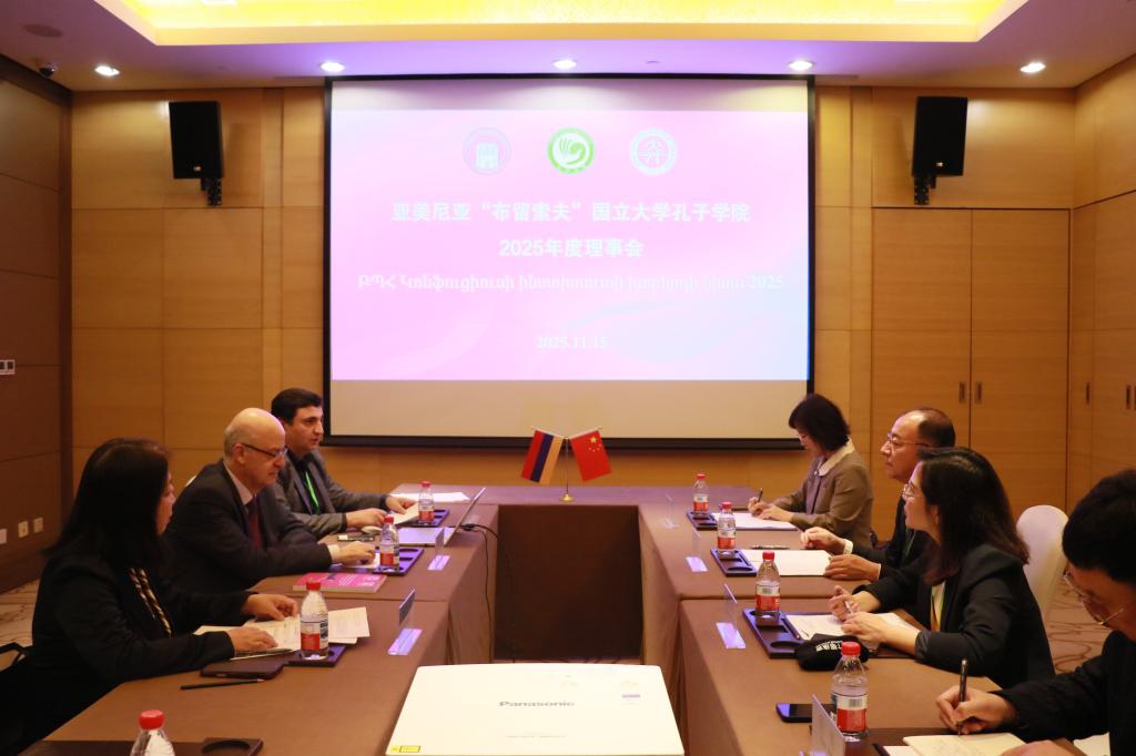 11月15日上午,世界中文大会期间,2025年度亚美尼亚“布留索夫”国立大学孔子学院理事会议于北京国家会议中心召开。“布留索夫”国立大学校长、孔子学院亚方理事长大卫·久尔金扬(David Gyurjinyan),beat365校长、孔子学院中方理事长丛明才,孔子学院中外方院长、孔子学院工作办公室相关负责人共同参会。