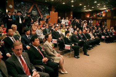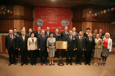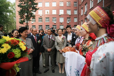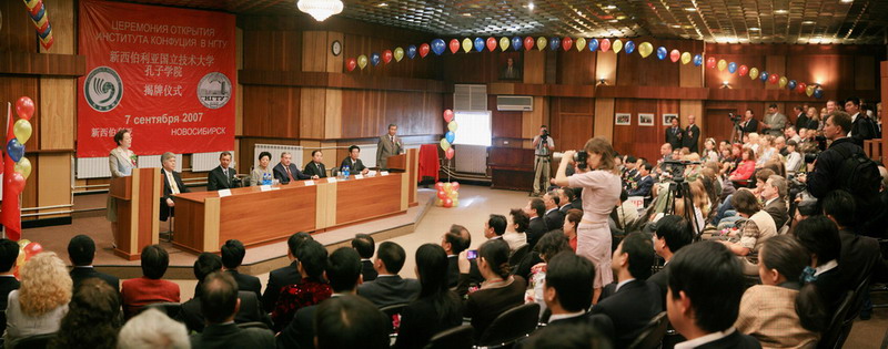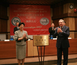 2007年9月7日上午9:30,我院与俄罗斯新西伯利亚技术大学联合举办的孔子学院成立揭牌仪式在俄罗斯新西伯利亚市隆重举行。中国国务院国务委员陈至立、中国教育部部长周济、外交部副部长乔宗淮、中国驻俄罗斯大使刘古昌、俄罗斯新西伯利亚州州长 塔拉孔斯基、 新西伯利亚技术大学第一副校长拉斯塔尔古耶夫出席了开幕式并在主席台前就座。辽宁省教育厅副厅长李树森、外事处处长李庆才也专程赴俄参加了孔子学院的开幕式。我院院长孙玉华、教务处处长刘宏、汉学院副院长任雪梅、孔子学院副院长王婵娟代表学院参加了开幕式。出席开幕式的还有国家教育部汉办主任许琳、政府各大部委相关领导、德、法等欧洲各国驻俄新西伯利亚总领事等。