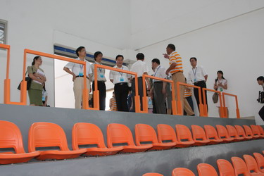 9点40分,评估专家组来到了我院风雨操场,体育教学部主任郭继敏为专家们介绍了风雨操场的建设和使用情况。