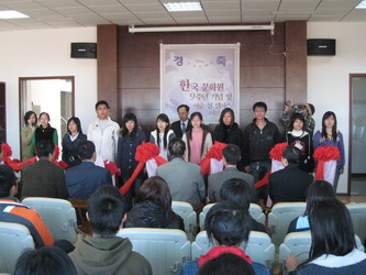 11月2日下午2时,我院韩国文化院成立九周年暨旅顺新校区韩国文化院开院仪式在院图书馆隆重举行,专程从韩国来出席仪式的韩国东西文化开发交流会副会长孙正来、文化院院长许基先、韩国著名学者李光镐及部分韩国朋友;我院原副院长孙吉田,院国际交流处副处长丁一贵,保卫处处长杨寿新,韩国语系书记徐学永、主任何彤梅,软件学院、图书馆的代表及韩国语系部分师生应邀出席了仪式。