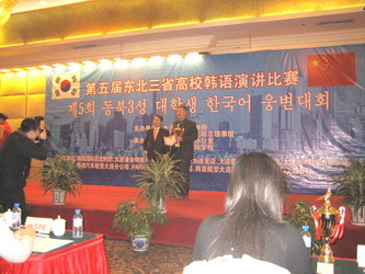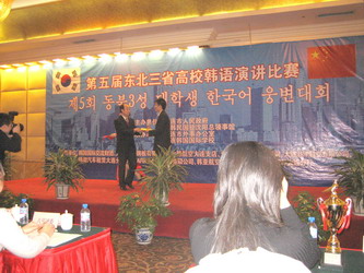 11月25日,第五届东北三省高校韩语演讲比赛在大连富丽华南山花园酒店圆满落下帷幕,来自我院、 黑龙江大学、辽东学院、辽宁大学、延边科技大学、齐齐哈尔大学、长春理工大学和吉林师范大学等12所大学的参赛选手展开了激烈的角逐。我系学生袁晓龙和沈克亿不负众望,从24名参赛选手中脱颖而出,分别夺得冠亚军,同时获得团体第一名的好成绩。当日,韩国驻沈阳总领事馆总领事朴圣雄、大连市副市长邢良忠等领导出席了比赛并为获奖选手及单位颁奖。