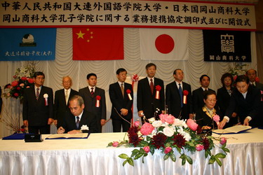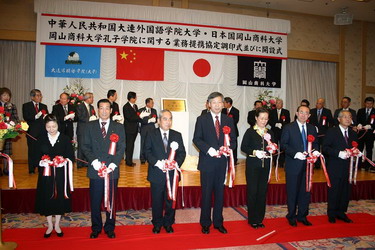 经过近一年中日双方的共同努力,我院与日本冈山商科大学共建的孔子学院在日本正式成立。2007年11月25日上午10:30(日本时间),两院联合举办的孔子学院成立揭牌仪式在日本冈山市广场大酒店隆重举行。中国驻日本东京大使馆公使衔参赞孙建明、中国驻日本大阪领事馆教育室领事刘占山以及来自日本冈山县行政、经济、教育界的代表们共一百余人出席了揭牌仪式。辽宁省教育厅外事处处长李庆才也专程赴日参加了孔子学院的揭牌仪式。我院院长孙玉华、日本语学院院长刘利国、院务办公室主任王庆九、汉学院直属支部书记潘晓春、孔子学院中方院长汪灵灵、日本语学院教师苏君业一行六人参加了揭牌仪式。