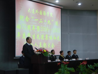 最后,学院党委书记姜连平做了重要讲话。他首先对获奖集体和个人表示祝贺,对辛勤工作的全校教育工作者表示衷心的感谢。姜书记在追忆了“一二 • 九”运动及其深远的历史意义之后,强调在新时期努力学习,开拓进取,为民族的复兴、国家的强盛谱写新的历史篇章才是纪念“一二 • 九”运动的真正意义。随后,姜书记与大家一同回顾了过去的一年,2007年对大外来说,意义格外重大——乔迁新校区,迎接本科教学水平评估。大外人不负众望,同心同德,团结拼搏;领导们高度负责,严谨高效;教师员工们,不辞劳苦,忘我工作;同学们热情饱满,积极配合。终于在全体大外人的努力下,出色的完成了各项任务,得到了评估专家的高度评价,学院还以评估为契机,深化教学改革,提高办学水平和教学质量,各方面事业都上了一个全新的台阶。最后, 姜书记向同学们提出了希望和要求,他希望受表彰的先进集体和先进个人谦虚谨慎,戒骄戒躁,珍惜荣誉,再接再厉,进一步广泛深入地开展“争先创优”活动,扎实有效地促进校风、学风建设,齐心协力,为大外的不断发展而努力奋斗。