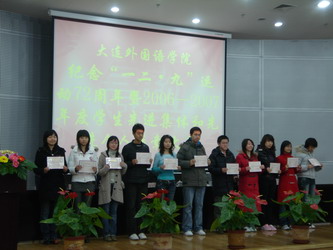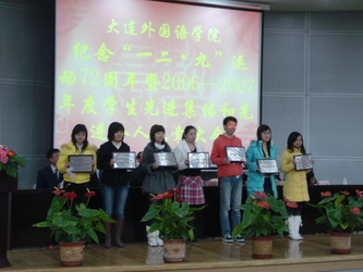 大连市大学生标兵、我院大学生标兵应用英语学院2004级李俊代表获奖学生发言。 他表达了全校同学对革命先烈的缅怀之情和崇高的敬意,并表示将继承“一二 • 九”先烈的遗志,秉承“崇德尚文、兼收并蓄”的校训,刻苦学习,立志成才,化强烈的爱国热情为刻苦学习的动力,为祖国的建设发展和中华民族的伟大复兴而拼博, 继续发扬爱校之情,建校之志,刻苦学习,立志成才,决不辜负学校老师的希望。