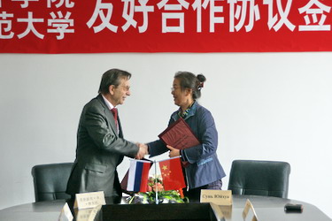 21日上午10点30分,院长孙玉华在新校区会见了代表团一行,双方就两校的交流合作及其具体事宜进行了探讨和磋商,并签署了两校友好合作协议。首批留学生将于今年9月互派。签字仪式结束后,代表团参观了我院新校区、图书馆、电教馆等场所,并同我院俄语系师生进行了交流座谈。