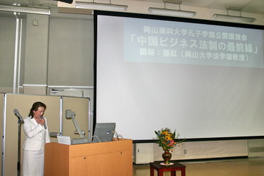 孔子学院院长冈本辉代志教授首先致词,他全面详细地介绍了孔子学院的经纬并对张红教授的讲演表示热烈的欢迎。张红教授以“ 中国 商事法制最前沿 ”为题,讲述了当前中国和日本股市内部交易方面的典型案例及相关法律政策。同时还介绍了目前在华日资企业的概况,并就日企在聘用律师方面提出了建议,引起了在场听众的极大兴趣。结束后,听众踊 跃提问,会场气氛非常活跃。此次讲演,虽然涉及到了一些专业问题,但由于冈山地区有着比较多的在华投资,也由于此次讲演介绍了目前中国商事法制的最前沿的问题,因此 讲 演 会受到了大家的热烈欢迎。