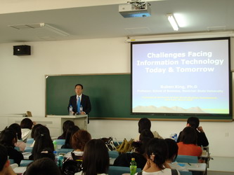 邢教授本次来应院将他最新的科研成果和国外有关IT与商务行业的最新动态讲授给同学们,其中有商务计算机硬件软件的介绍、网络的各种连接方式、数据库的结构及管理模式、网络安全等一系列问题。邢教授的讲课深入浅出、图文并茂,得到同学们的一致好评。邢教授对应院听课学生的学习热情和英语能力给予了很高的称赞,同时鼓励大家认真学习计算机知识,将来成为IT与商界的精英。