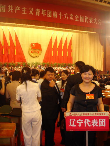 6月10日的人民大会堂歌声飞扬,洋溢着浓郁的青春气息。大礼堂主席台台口上方悬挂着“中国共产主义青年团第十六次全国代表大会”的会标。后幕正中,庄严的团徽熠熠生辉,两侧是10面鲜艳的红旗。二楼眺台的巨型横幅上写着:“紧密团结在以胡锦涛同志为总书记的党中央周围,以邓小平理论和‘三个代表’重要思想为指导,深入贯彻落实科学发展观,团结带领广大团员青年,为夺取全面建设小康社会新胜利而奋斗!”。1500多名来自全国各地的团十六大代表,肩负着7500多万共青团员的重托出席盛会。我院团委书记张皎作为辽宁团唯一高校代表、大连团四位代表之一参加了此次团代会。