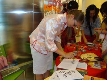 文化节上孔子学院展示了中国京剧、中国菜肴、中国古迹、中国服装和古老文明五大系列。充满民族特色的展台布置,色香味俱全的中国菜肴引起市民的极大兴趣。市民纷纷前来品尝中国菜肴,尝试使用筷子,展台前营造出浓浓的节日气氛。孔子学院的两位志愿者,还登台表演了中国民族歌曲《茉莉花》,更是博得阵阵掌声。特别是现场播放的风光片“美丽的大连”,吸引了无数市民观看。观光在大连,学习汉语在大外的片尾语深入每位参观者的心里。