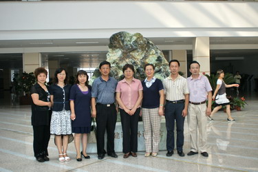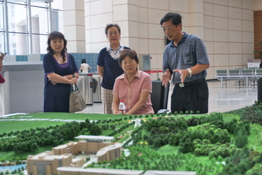 在分别沿外环、内环路对校园进行了总体参观后,葛华副司长来到了图书馆。副院长朱公巍结合大型沙盘——“大连外国语学院规划模型”详细介绍了旅顺校区的建设过程、建筑风格、功能分区及未来发展规划等,朱院长说,我院旅顺校区的建成彻底地摆脱了办学空间狭小的束缚,新校区的建设充分体现了现代化、人文化、智能化和数字化的特点,教学软硬件条件均已达到国家标准,大量预留地的保留更是为学院的进一步发展提供了可靠的保障。图书馆副馆长张泽梅介绍了图书馆开放式、节能化的设计理念,现代教育技术中心主任赵余博介绍了IPTV和校园网络设备的基本情况。随后,葛华副司长一行在岫岩玉鹰像前合影留念。