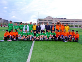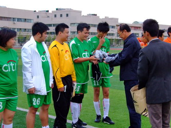 赛后,我院党委副书记李宝章和花旗银行代表东亚地区总裁Mr.Tom,为花旗—大外第二届“学者杯”足球友谊赛获胜方颁发了奖杯,为双方队员颁发了纪念品,并约定此项赛事明年将继续进行,我们期待着花旗—大外第三届“学者杯”足球友谊赛更加精彩。