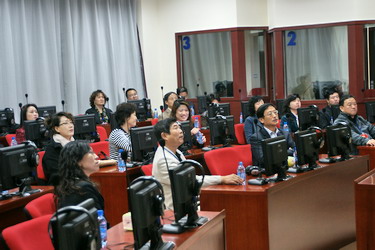 在沿外环、内环路对校园进行了整体参观后,政协委员一行人来到了现代教育技术中心同声传译室,副院长朱公巍致简短的欢迎词,随后陪同客人观看了校情片。现代教育技术中心主任赵余博从技术支持外语教学的角度介绍了学院的网络资源建设情况及计算机教室、语音室、同声传译室、录音棚、自动录播教室的建设和使用情况。