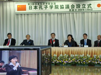 本次会议的议程主要为日本孔子学院协议会签字仪式和院长会议两项。4日上午,进行了协议会签字仪式开幕式。为了加强日本各孔子学院及孔子课堂之间的联系与合作、达到资源共享、共同协调发展,日本成立了日本孔子学院协议会,这是世界各地孔子学院中首个自发成立的孔子学院联合组织。本次签字仪式开幕式,国家汉办以许琳主任为主的主要领导成员及北京地区部分相关孔子学院中方合作院校校长等均通过网络视频出席了会议,即在北京孔子学院总部通过网络视频系统与日本同步举行会议。此次启动视频系统在不同地域以同声传译方式同时举办会议,在汉办也尚数首次。会议现场,汉办以王永利副主任为代表的一行人士出席了会议,中国驻日本大使馆孙健明公使参事官、中国驻大阪总领事馆刘占山领事等均出席了会议。会议开始,北陆大学校长、北陆大学孔子学院理事长发表了热情洋溢的致辞;孙健明公使参事官代表中国驻日本大使馆全权大使崔天凯发表了贺词;许琳主任代表汉办,对日本孔子学院协议会的成立表示热烈祝贺,并对日本孔子学院提出了殷切的希望。北京与日本同步举行会议,掌声同时响起,开创了孔子学院会议的先河。开幕式后,各孔子学院理事长分别签了字,孔子学院协议会即时生效。
