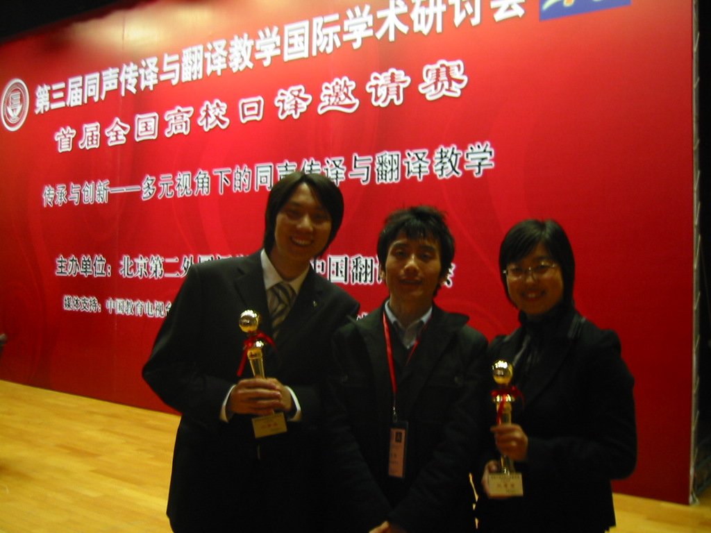 11月7日至11月9日,首届全国高校口译邀请赛在北京第二外国语学院举办,该项赛事受到广泛关注。我院选派的解放同学和郭帅同学分别参加了日语同传比赛和日语交传比赛。两名选手在集训时间较短,高手如云的情况下,毫不畏惧,充分发挥了自己的优势,在复赛中淘汰部分选手顺利挺进决赛,并且在决赛中,进一步克服自己的不足,超越自我,取得了优异成绩。其中,解放同学获得日语同传比赛二等奖(总排名第二),郭帅同学获得日语交传比赛三等奖(总排名第四),评委对我院的选手给予了高度评价。