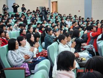 报告结束后,张立新展示了在奥运会上获得的四块金牌并与大外学子开始了面对面的交流。场内学生积极提问踊跃发言,气氛十分活跃。张立新的真诚质朴,平易近人更是深深打动了在场的每一个人。最后,他与全场师生们合唱了一曲《真心英雄》,歌声中有着同学们深深的祝福,祝愿他一生平安。 整场活动持续了两个多小时,会场反响热烈,多次博得师生经久不息的掌声,不断将气氛推向高潮。旅顺电视台对整场报告进行了全程采访与报道。