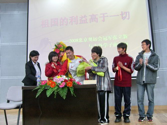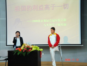 当身着奥运队服的张立新步入报告厅时,全场师生用热烈的共青团所特有的“黄金掌声”欢迎这位奥运冠军的到来,院团委书记张皎主持了此次报告会。从张立新的报告中,我们更加深刻地了解到了这位残奥会冠军背后的故事,他曾经和我们一样,是一个健全的人,但病魔在他16岁那年无情地夺走了他的左腿。他也曾经伤心过,自卑过,绝望过。但是他并没有在人生的十字路口处迷茫过久。母亲无微不至的照顾、大连残联的关怀与教练的器重与栽培给予了张立新追求新生的力量!从自闭家中到被吸纳入轮椅竞速队,从普通队员成长为竞速满贯王。这一切,都浸透了无数汗水与血泪、无数次的跌倒与无数次倾尽全力、永不服输的呐喊!在场师生倍受感动,一次次的落泪。