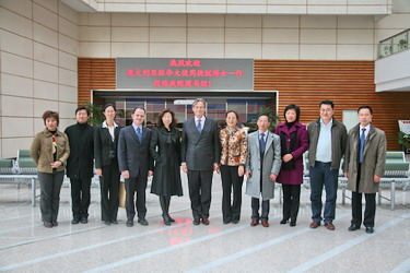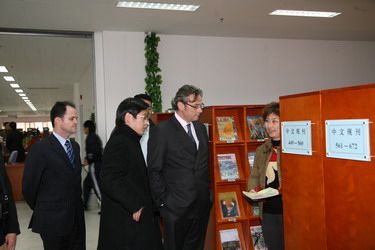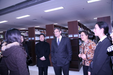 在分别沿外环、内环路对学院进行了总体参观后,苪博士一行来到了图书馆。馆长刘日升、副馆长张泽梅接待了客人。张泽梅副馆长介绍了我院图书馆的占地面积、藏书量、功能分区及开放式、人性化的服务管理模式、节能化的设计理念。客人们分别参观了期刊阅览室和中文图书阅览室。苪捷锐博士还用英语和我院学子亲切交谈,了解他们的阅读兴趣。