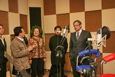 随后,苪博士一行人参观了现代教育技术中心,现代教育技术中心主任赵余博向客人介绍了我院的网络建设、在线教学、IPTV等情况。客人们参观了录播教室、录音室、计算机教室、同声传译室、语言实验室。在录音室,芮博士听到了熟悉的澳大利亚民歌;在同声传译室,看到了澳大利亚的电视节目,他对我院教学设施的先进性表示由衷地赞叹。