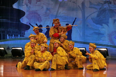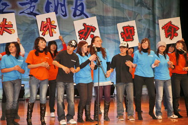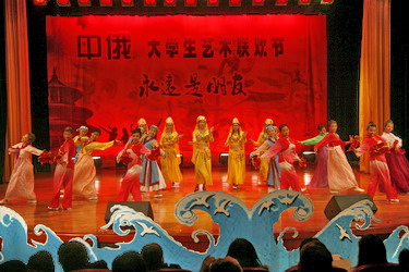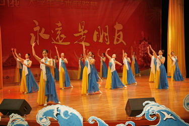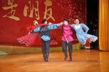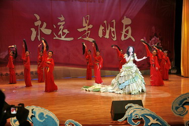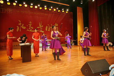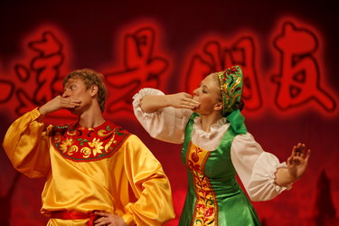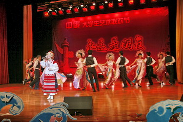 随后,《永远是朋友》开幕式文艺演出正式开始。一曲美丽的《大海啊,故乡》把全场观众带到了美丽的大海边,共同回忆那在海边长大的童年。在现场热烈的气氛中,国际艺术学院吴丽君教授用一首优美典雅的歌曲《2008 礼》向远到而来的俄罗斯朋友们诠释了中国这个礼仪之邦对他们最诚挚的欢迎。紫云萱乐坊带来的器乐合奏及现场书法表演《茉莉花》、武术《中国功夫》、古装现代舞《床前明月光》、民族舞《吉祥颂》尽显了中国人的传统文化、豪情奔放与柔情诗意;古典舞《飞天》,把全场观众带到了遥远的敦煌,歌伴舞《天空》更是让全场观众都变成了和平鸽在和平的天空下飞翔。大连市京剧团表演的京剧《大闹天宫》让现场的观众一睹国粹的风采。由远东大学歌舞团呈现的节奏明快的俄罗斯古典舞《谢肉节》以及诙谐幽默的舞蹈《向女人献殷勤的人们》则诠释了俄罗斯独特的民族风格和审美情趣,特别是中俄大学生一同演绎的歌伴舞《喀秋莎》和街舞《俄罗斯旋风》、合唱歌曲《大外欢迎你》更是把晚会推向了高潮。文艺演出过程中还进行了中国大学生和俄罗斯大学生交换信物,当秀美的向日葵和高贵的牡丹花一簇绽放,当中国的福娃与俄罗斯的套娃共同露出甜美的微笑,这一刻“永远是朋友”的主题诠释的淋漓尽致。