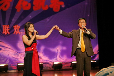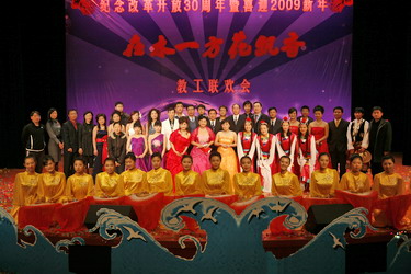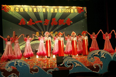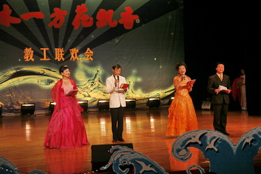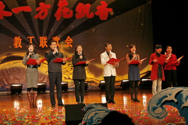 今年的联欢会与以往不同。08年是我国不平凡的一年,中国人民经历了太多的考验。汶川地震,曾牵动着亿万中国人的心,也牵动着全世界人民的心。在第二版块“ 山花烂漫 大爱兴邦”演出中,由首届青讲赛教师和一线教师表演的配乐诗歌散文朗诵《园丁·阳光·天使》,在李虹瑾钢琴伴奏的乐曲声中,让我们目睹了天地无情,见证了大爱兴邦的民族力量,见证了人民教师的热血衷肠;张宇飞的钢琴弹唱《暗香》,歌声和琴声交响在一起,声声入耳,曲曲动人;王翱及艺术学院学生表演的古筝合奏《战台风》,时而象高山流水,时而似潺潺小溪,时而如洪钟大吕,彰显了中国人民不屈不挠的精神和大爱兴邦的民族力量;殷占录演唱的《卓玛》,用歌声表达了藏家儿郎对亲人的眷恋,在他的歌声中让我们仿佛闻到了沁人心脾的草原芳香;申鑫演唱的《好运来》,宛如甘泉,那样甜美,又似一泓溪水,清澈透明,被称为小祖海的她,唱出了祈福我们伟大的祖国好运来,祈福大外好运来,祈福全天下的大外人好运来!
