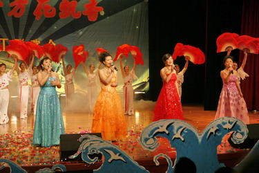 联欢会在 开场歌舞《欢聚一堂》中拉开序幕,70余名演员演绎了红梅花开,在水一方; 山花烂漫,大爱兴邦;花果飘香,超越梦想三个版块的文艺节目。