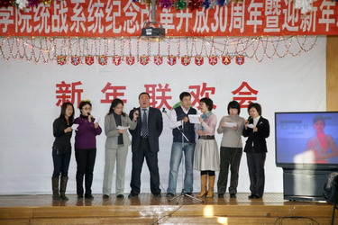 12月26日下午2:00,我院统战系统纪念改革开放30周年暨迎新年联谊会在汉学院多功能厅举行,学院党委书记姜连平,院长孙玉华,党委副书记李宝章、副院长张守鹏、朱公巍,院长助理杨俊峰及市委统战部、市政协、市侨联、市台联、各民主党派市委的相关领导出席了活动。我院各民主党派成员,各级人大代表、政协委员,无党派人士,少数民族代表,归国留学人员,党外知识分子代表,归侨、侨眷代表和学院各总支、直属支部书记100余人参加了联谊会。