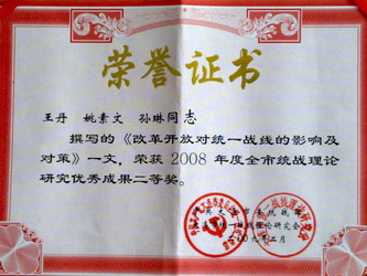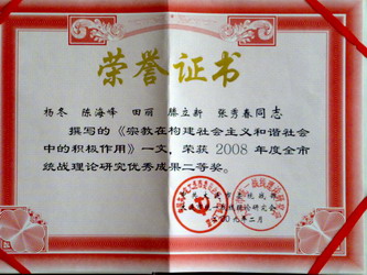 根据《关于表彰2008年度大连市统战理论研究优秀成果的通报》(大委统发 [20094号)文件精神,经市统战理论研究会评审委员会审议,我院杨冬、陈海峰、田丽、滕立新、张秀春的课题《宗教在构建社会主义和谐社会中的积极作用》;王丹、姚素文、孙琳的课题《改革开放对统一战线的影响及对策》顺利结题并荣获“2008年度全市统战理论研究优秀成果二等奖”。