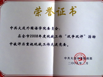 在2008年度大连市统战信息工作的表彰活动中,我院宣传统战部上报的信息多条被省、市领导部门采用,总计分数名列大连高校第五名并受到表彰。