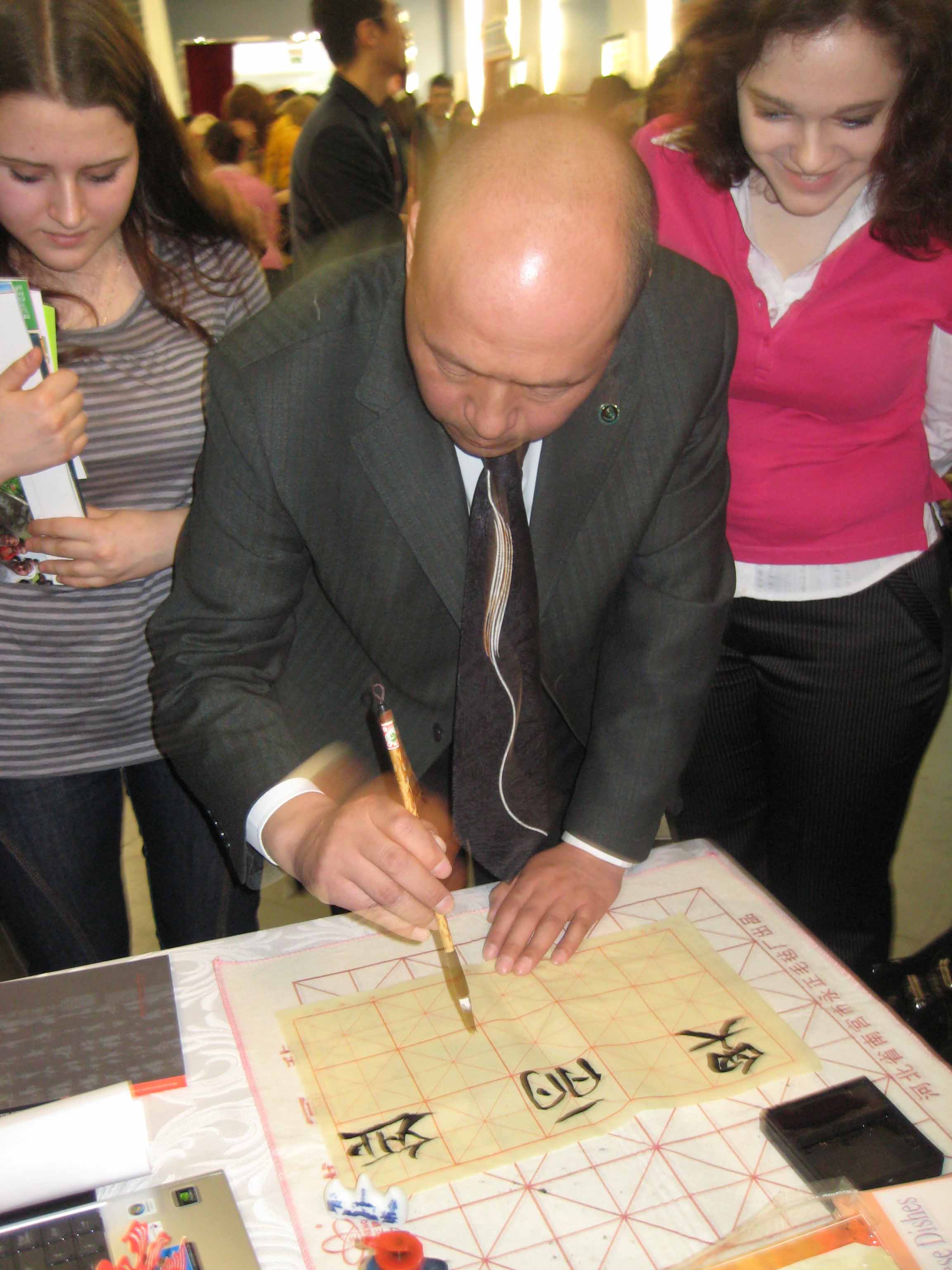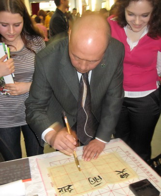 最引起公众兴趣的莫过于展台前现场展示的中国软笔书法。大家纷纷来到展台前学着用毛笔书写自己的中文名字和一些祝福的话语。为了亲自体验一下毛笔的魅力,孔子学院的展台前甚至一度排起了长长的队伍。