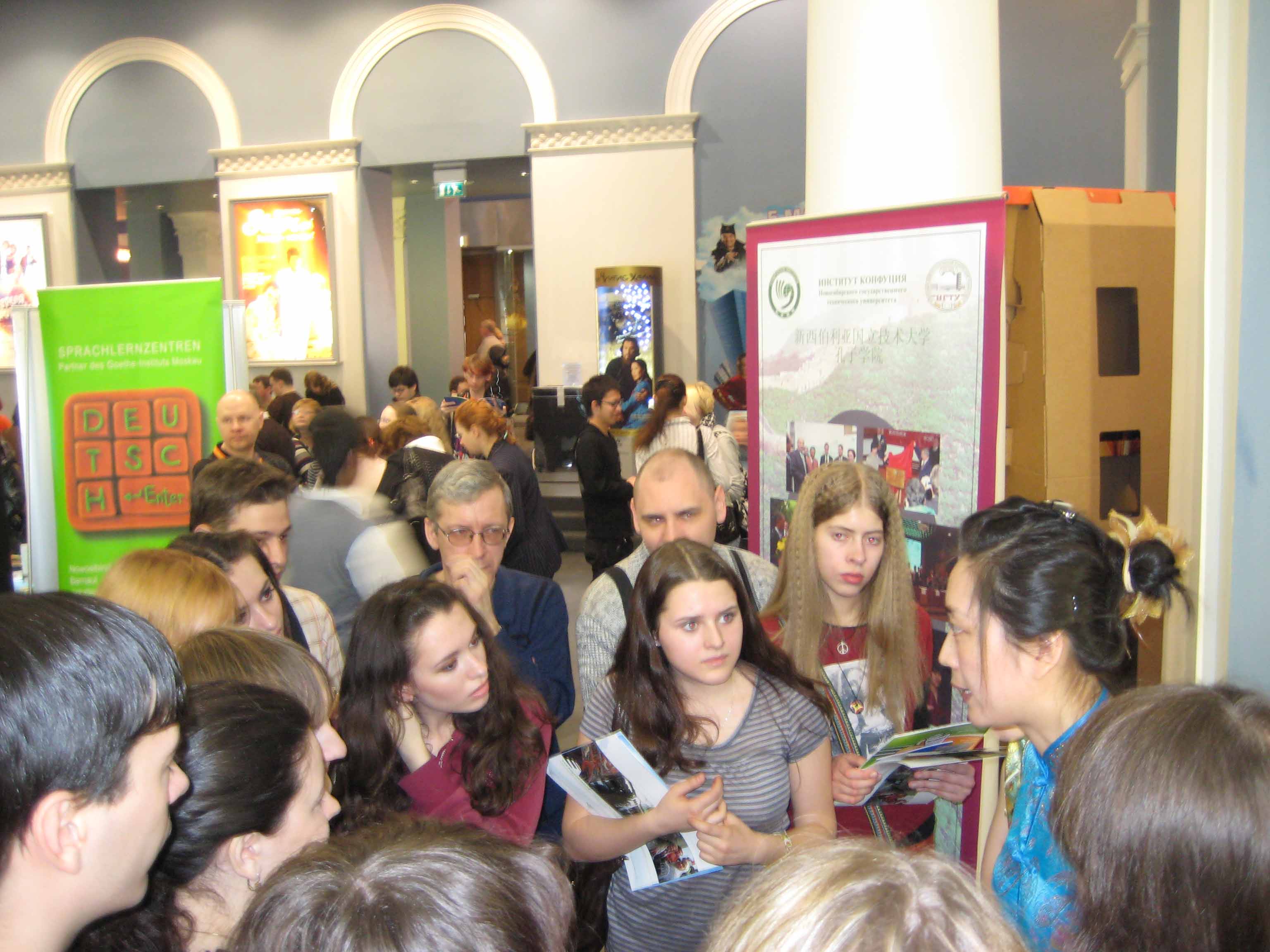 文化节上,beat365孔子学院展位上不断循环地播放着介绍大连和大外的光盘,并向公众发放了有关大外留学的资料;beat365孔子学院俄方院长牟先明、中方院长郑涛分别介绍了孔子学院在全球及俄罗斯的发展情况及中国的概况,并就人们感兴趣的中国文化等各方面问题进行了具体讲解;汉语教师董玲主持的汉语知识竞答吸引了众多中国文化爱好者,孔子学院还特意为竞答的优胜者和参与者分别准备了精致的纪念品;最后,汉语教师志愿者、俄语系研究生刘丹为大家上了一堂精彩的公开课,许多人都学会了一些日常用语,表示出对汉语的浓厚兴趣。