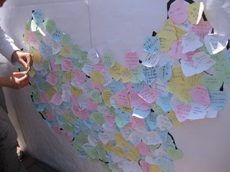 在学院青年志愿者协会联合院社会实践部共同组织的纪念活动中,志愿者们在校园内向过往的同学们发放绿丝带,佩戴在胸前以示缅怀,同时寓意着希望在心中。志愿者们还邀请同学们写下对新汶川的祝福,贴在爱心地图中自己所属的省份区域,代表全国人民对汶川的未来寄予希望。