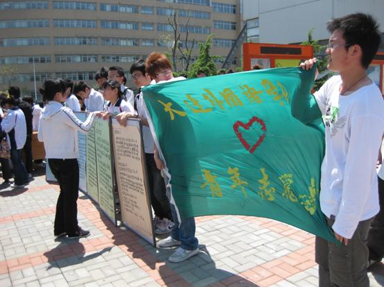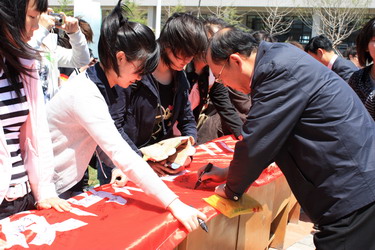 学院大学生记者团在风雨操场门前举行了以“汶川一岁,拥抱爱”为主题的大型签名活动。院党委副书记李宝章亲临现场,在横幅上签下了自己的名字,并代表大外学院领导表达了对灾区人民的美好祝愿。活动现场,身着素装,手持横幅的大外学子用实际行动寄托对逝者的哀思,号召其他人一同追思这个令亿万中国人民悲痛的日子。全院师生员工纷纷踊跃参与到签名活动中,用笔在写有“汶”世间情为何物 唯大爱海纳百“川”的横幅上写下祝福的话语,郑重地签下自己的名字,白板上贴着同学们用纸剪成的心形卡片,以表达对逝者的悼念和对四川人民的支持。
