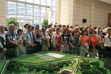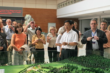 在沿内环、外环路对学院进行了整体参观后,中俄大学校长一行重点参观了图书馆和现代教育技术中心。在图书馆,副院长朱公巍结合“大连外国语学院规划模型” 沙盘详尽介绍了新校区的建筑布局、功能分区。朱院长说,旅顺校区坐北朝南,面朝大海,建筑设计在保持原有地形、地貌的基础上,充分体现了生态化、环保型的以人为本理念。作为辽宁省和大连市的重点工程,我院新校区以现代化、人文化、智能化和数字化的特点而备受好评,最终容纳能力将达到约2万学生,新校区的建设为学院的发展壮大提供了广阔的空间。图书馆馆长刘日升、副馆长张泽梅陪同来宾参观了电子阅览室、期刊阅览室和中文图书阅览室。俄罗斯来宾饶有兴致地和我院学子用俄语交流,了解他们的学习情况及兴趣爱好。