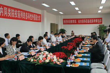 随后,在行政办公楼410会议室,党委书记姜连平代表全院师生员工对上级领导莅临我院考察指导工作表示热烈的欢迎和衷心的感谢。院长孙玉华作了题为《开拓创新突出特色 服务地方 追求卓越》的工作汇报。汇报包括四部分,一是学院概况;二是发挥优势,突出特色,增强为社会服务的能力;三是毕业生就业工作成效显著;四是今后工作的总体思路和发展重点。孙院长指出,近年来我院发挥学科优势,彰显专业特色。通过设立复语专业,积极与国外高校联合创办新专业,根据区域经济社会发展需求建立新专业等方式,填补了东北地区专业人才培养空白。我院不断强化教育教学的内涵建设,以国际化办学为平台,突出特色,强化内涵,提升办学质量。学院利用国际化办学资源,以“2+2”、“3+1”、“3+1+2”等形式与国外院校合作建立了 本科双学位、 本硕连读 、本硕博连读等多元化的人才培养模式。 通过与中西论坛促进经济技术合作咨询委员会联合建立中西拉美学院,在俄罗斯、日本和韩国成立三所孔子学院,建立教育部“中俄大学生交流基地”,建立汉语国际推广基地以及即将成立中国俄语中心等重大项目不断 扩大影响力,打造大外国际化办学魅力。 在谈到今后工作的总体思路和发展重点时孙院长说,一是认真做好学院更名工作,使该项工作成为学院教育事业发展的助推器。二是认真规划好、落实好优势特色重点学科的建设工作,突出特色,努力提升学科建设层次和建设水平。三是以服务地方经济社会发展为己任,构建多元化的人才培养体系。四是进一步贯彻落实教育部教育教学质量工程各项工作,构筑具有我院办学特点的人才培养特色。五是积极利用学院的国际交流与合作平台,努力打造大外品牌,为中华文化在全世界的广泛传播贡献自己的力量。