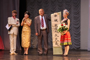 巡演期间,我院代表团遴选的节目力图通过不同的艺术形式,表现中华民族五千多年的传统文化和精髓。充满民族风情的《康定情歌》,悠扬欢快的二胡独奏,传统生动的现场书法“中俄友谊地久天长”,国粹艺术京剧名段《铡美案》,端庄优雅的古典舞蹈《飞天》,活泼欢快壮族舞蹈《山歌好比春江水》,刚中带柔的《中国功夫》,高亢动听的民族歌曲《天路》、《大地飞歌》,喜庆欢腾的歌舞《好日子》等丰富的艺术形式,传统的文化风格使西伯利亚地区的人民近距离接触了中国无穷的文化魅力,中国民族文化的多姿多彩让邻邦的俄罗斯友人们感到无比惊叹。俄罗斯美丽的姑娘和帅气的小伙子们也带来了精彩的表演,充满了浓浓的俄罗斯异域味道,让我们也感受到了俄罗斯人民的好客和友好。中俄两国歌曲的互动演唱更是将晚会推向高潮。每场演出的现场气氛十分热烈,演出剧场均座无虚席。演出结束后,观看晚会的嘉宾都上台与全体演员合影留念,并亲切地向巡演团的演员们问好,对巡演团带来这样一台视觉盛宴表示感谢,中俄友谊在这个美好时刻绽放光彩。