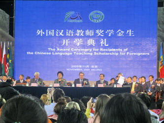 2009年11月10日,国家汉办在北京外国语大学隆重举行“千名外国汉语教师培养奖学金生开学典礼”,国务委员刘延东、教育部部长袁贵仁、奖学金生国家驻华大使、各培养高校的校长等嘉宾出席了开学典礼。学院院长孙玉华出席了开学典礼,并在主席台上就座。我院奖学金生培养单位代表,文化传播学院院长周玉琨、汉学院副院长潘先军和汉语国际教育硕士奖学金学生16人参加了会议。