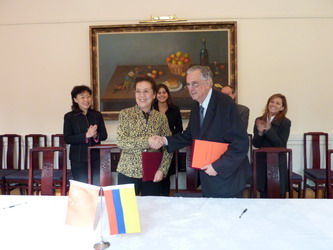 2009年12月11日上午,学院院长孙玉华一行在哥伦比亚驻华使馆与伊菲特(Escuela de Administración, Finanzas y Tecnología )大学签署了共建哥伦比亚麦德林孔子学院执行协议书。至此,我院第四所孔子学院的成立也已经尘埃落定。西班牙语教授刘永信、德语系党总支书记樊晓霞、宣传统战部副部长姚素文参加了签字仪式。