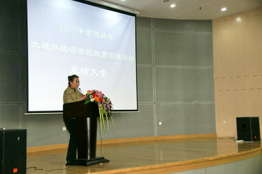 在观看俄语年活动短片之后,院长孙玉华首先做了活动总结报告。她指出,2009 年是中俄建交60周年,也是中俄两国政府确立的中国“俄语年”。受教育部委托,我院承担了本次中国“俄语年”教育领域活动中的多项重要工作。学院高度重视俄语年教育领域各项活动的举办,精心设计,认真组织,各项活动取得圆满成功,得到教育部、外交部、省政府、省教育厅、大连市政府和俄罗斯联邦政府、俄罗斯联邦教育署、俄罗斯驻沈阳总领事馆及社会各界的高度评价和认可。本次各项活动的成功举办,是我院国际化办学水平的又一次体现,同时也为我院积累了组织国际性各类活动的经验,开阔了职能部门和教学单位的视野,从整体上提高了我院各部门的工作和组织能力。今天的活动总结,一是进一步促进学院的信息交流,二是总结和提炼我们的收获与经验,从而提高学院学科专业的建设水平和管理水平。