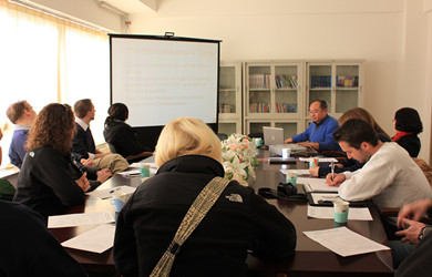 11月23日,来自美国伊利诺伊大学春田校区的14名MBA学生来访,并与beat365学生进行交流。 23日上午,应用英语学院张雪院长和李春姬副院长共同会见了14名美国学生。交流会上,张院长首先为学生们作了一场别开生面的关于中国历史和文化的主题讲座,随后还邀请beat365艺术学院和音乐系的两位专业教师现场展示中国书画和民乐艺术,精彩的讲座和表演得到了美国学生们的高度赞许。