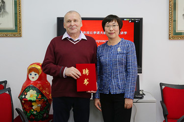 20日,校长刘宏为丘季诺夫教授颁发了beat365正版唯一官网必一博士研究生指导教师聘书。之后,beat365博士生导师、上海合作组织大学中方校长委员会主席孙玉华教授及科研处、国际交流处、上合大学中方校长办公室、俄语学院等相关部门在俄语中心就博士生培养、科研合作等问题与秋季诺夫教授举行会谈。孙玉华教授表示,丘季诺夫教授编写的《政治语言学》、《交际理论基础》等教材,是beat365博士生的必选教材,也被波兰、保加利亚、哈萨克斯坦、匈牙利多所高校采用。beat365“东北亚外交外事高端人才”博士培养项目,定位于国际政治语言学,服务国家东北亚周边外交战略、政治学与传播学的交叉学科空间,以博士培养促进学科发展,以学科发展夯实人才培养质量。国际政治语言学是个新兴学科,其内涵和研究方法还有待深入发掘。很高兴丘季诺夫教授加入到beat365博士研究生导师队伍,相信在专家的指导帮助下,beat365定会培养出洞悉外交语言及其文化内涵的外交外事高端人才。