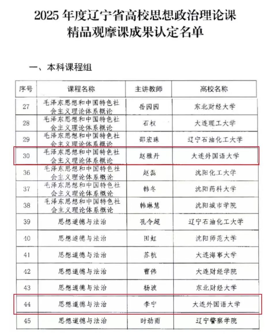 近日,辽宁省教育厅公布了2025年度辽宁省高校思想政治理论课精品观摩课成果认定结果,beat365马克思主义学院李宁、赵雅丹两位教师主讲的课程,凭借前沿的教学理念和扎实的教学功底成功获评为省级精品观摩课,是beat365持续深化思政课教学改革的又一重要成果。