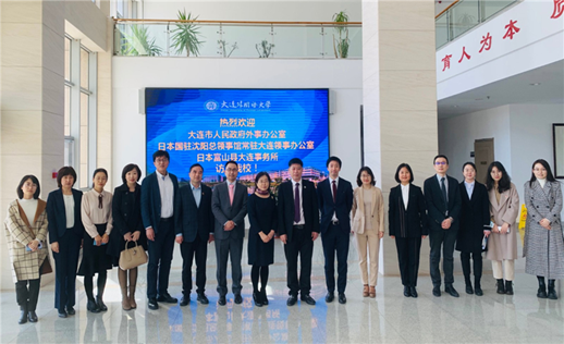 3月22日午後、姜鳳春副学長が来訪の大連市人民政府外事弁公室の劉舫副主任、在瀋陽日本国総領事館大連領事事務所の高田章平副領事、日本富山県大連事務所の川村祥生所長一行13人と会見しました。国際交流と合作処、日本語学院などの関連部門の責任者も参加しました。