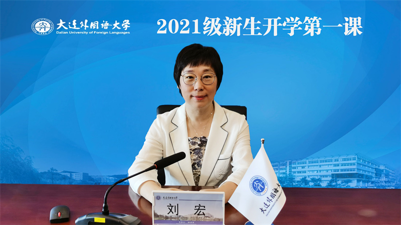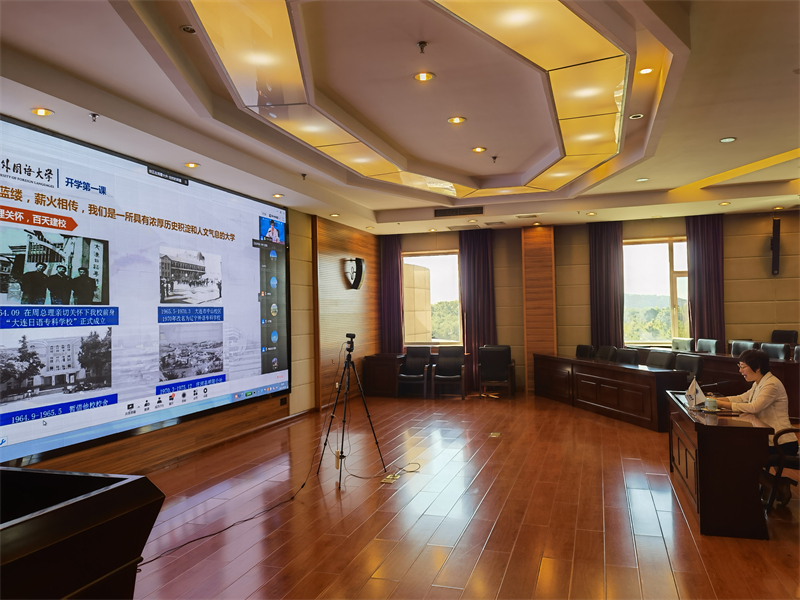 유홍 총장은 “청춘의 사명을 명기하고 시대의 중임을 짊어지자”라는 제목으로 ‘온라인 + 오프라인’ 방식을 이용한 첫 수업을 진행했다. 유홍 총장은 우선 우리대학의 57년의 분투과정과 이룩한 성과를 회고하면서 학생들에게 붉은 유전자를 계승하고 시대의 사명을 짊어지며 실제 행동으로 당과 한마음이 되고 시대적 책임을 다하라고 격려했다. 또한 유홍 총장은 올해는 중국공산당 창건 100주년이 되는 해로서 중국공산당창건 100주년 경축대회에서의 시진핑 총서기의 중요 연설을 학습하는 것은 청년 학생들에게 중요한 의미가 있다고 강조했다. 또한 학생들이 애국심을 청춘의 꿈을 실현하는 과정에 자각적으로 융합시키고, 국가의 대외개방 전략과 ‘일대일로’ 건설, 국가관리와 글로벌 거버넌스, 중화 언어 문화의 ‘대외 진출’, 국제전파 능력 건설과 문명의 상호 교류 촉진 등 면에서 힘을 기울이기 바란다고 하였다.