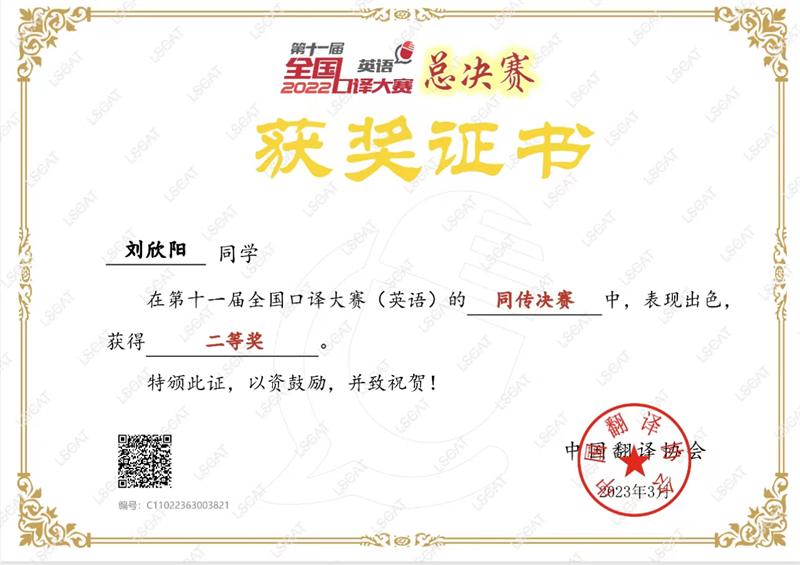 앞서 2022년 7월 상하이외국어대학교 제4회 다국어 릴레이통역대회에서는 2학년이던 류신양이 본선에 진출해 국내외 대학 통역 대학원생들과 경쟁했다. 대학 3학년이 된 후에도 류신양은 계속 통역에 대한 애정을 가지고 평소 연습을 강화하여 전국통역대회에서 수상함으로써 다시한번 우리대학의 영예를 드높였다.