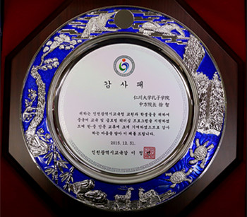 12월 30일, 한국 인천시교육청은 우리대학 인천대학교 공자아카데미 서지 원장에게 감사패를 전달하여, 서원장이 다년간 인천지역의 중국어 교육사업 및 중한 문화교류를 위해 기울인 노력에 감사의 뜻을 전하였다. 인천시교육청 양동현 사무국장이 직접 서원장에세 감사패를 전달하였고 인천 현지의 중초등학교 교장 및 교육청 담당자들이 전달 행사에 참가하였다.